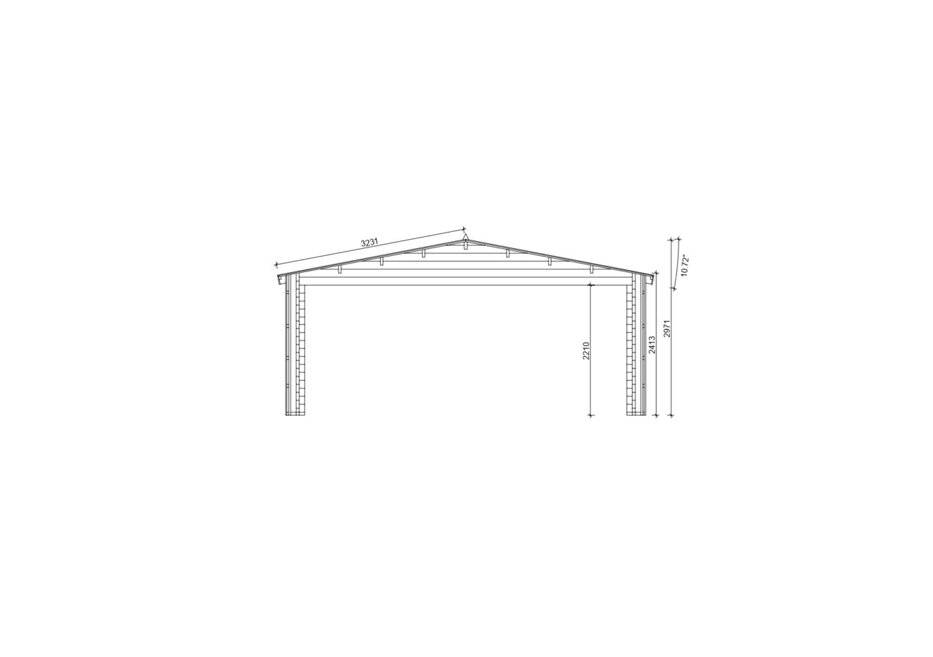 Das Satteldach mit einer Neigung von 11° und einem großzügigen Dachüberstand von 500 cm vorne verleiht der Doppelgarage Larix ein klassisches Aussehen und bietet gleichzeitig zusätzlichen Schutz vor den Elementen. Die robuste Konstruktion aus hochwertigen 44 mm starken Blockbohlen mit einer Außenverkleidung bildet eine Wandstärke von insgesamt 220 mm, was eine langanhaltende Stabilität und Widerstandsfähigkeit garantiert.